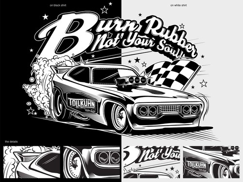 Seamless collar and double needle stitched. Must be able to be screen printed. Simply put the entire shirt design is hand illustrated from photos and design concepts that truly show the attitude and character of your car.